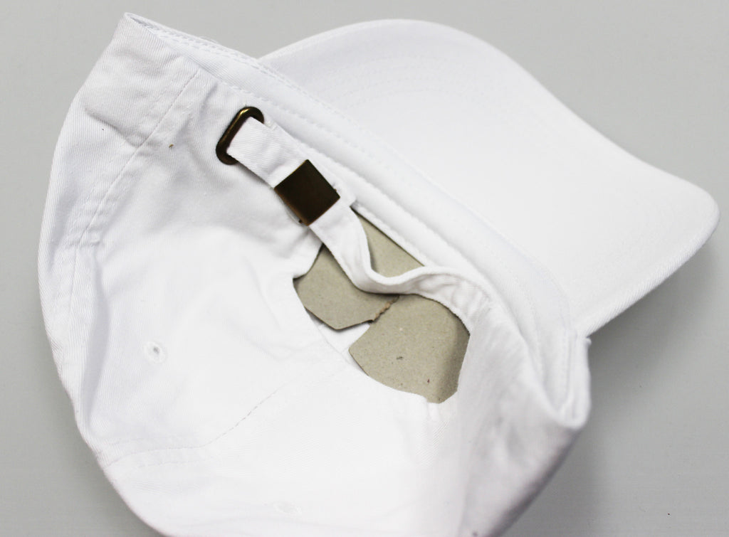 - Matching color sweatband, fabric hideaway closure with brass buckle and grommet.
